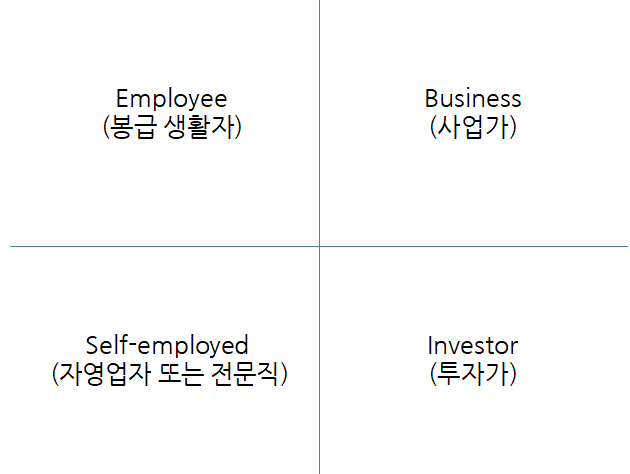 대부분의 직장인들은 돈을 번다 라고 하면 회사로부터 받는 월급만을 생각합니다. 그러나, 월급만으로는 부자가 될 수 없습니다. 부자 아빠 가난한 아빠의 저자 로버트 기요사키는 사업가(B), 투자가(I) 가 되어야 부자가 될 수 있다고 하였습니다.